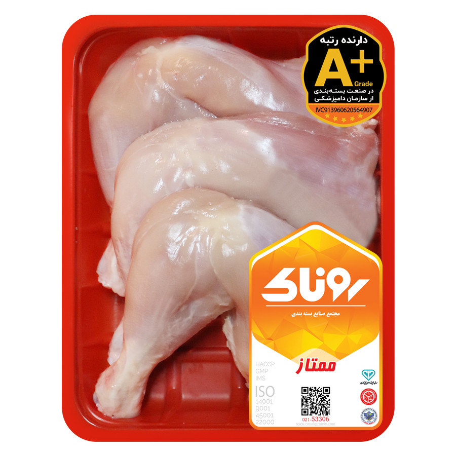 ران مرغ ممتاز روناک پروتئین علاوه بر یکدست و یک اندازه بودن کاملا پاک شده و بدون پوست و چربی است.